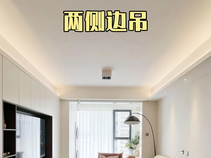 只吊两侧不压层高,线条灯藏在边吊缝隙里,视觉层次丰富;搭配灯光后氛围感拉满,小户型也能尽显高级感。