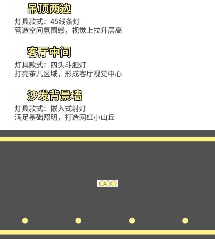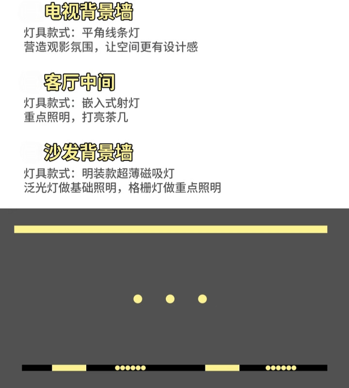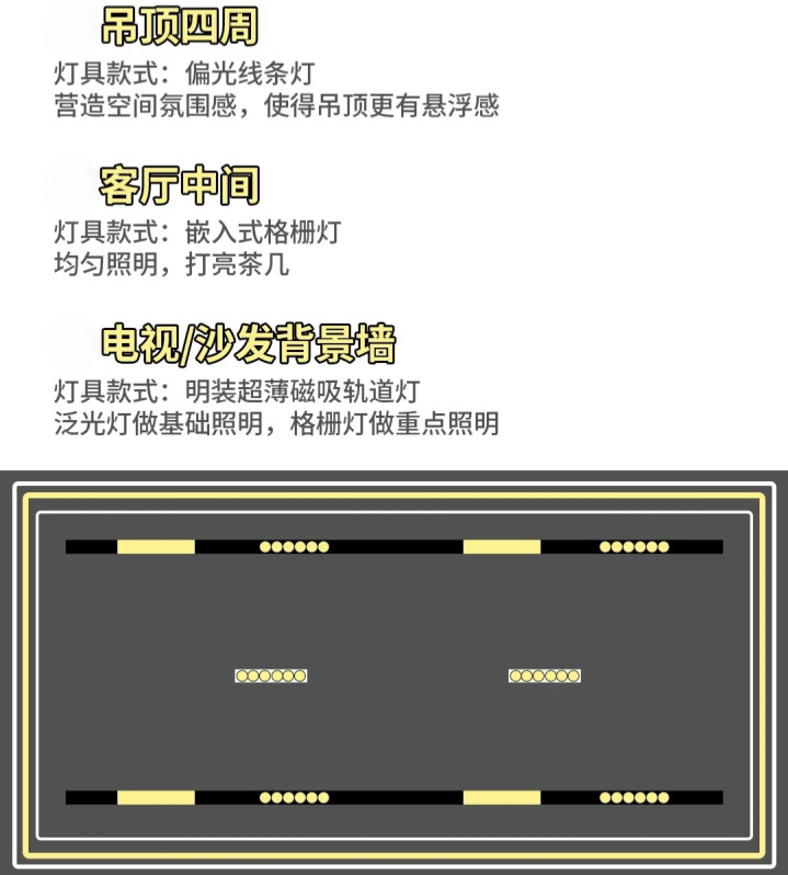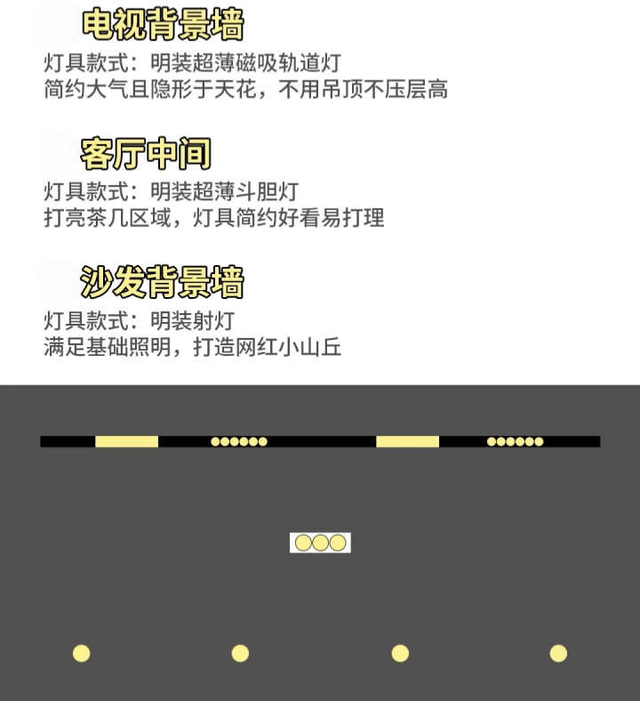 结语:所有方案都遵循 “基础光 + 重点光 + 氛围光” 的分层照明原则,色温建议选 3000-3500K 暖光或4000k中性光,营造温馨舒适的客厅氛围。