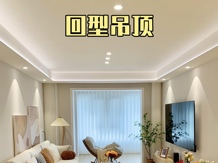回型顶适配 2.6 米以上层高,个人建议:一周下吊 20 公分足矣,灯光搭配可以用射灯 + 线条灯 + 斗胆灯的组合。