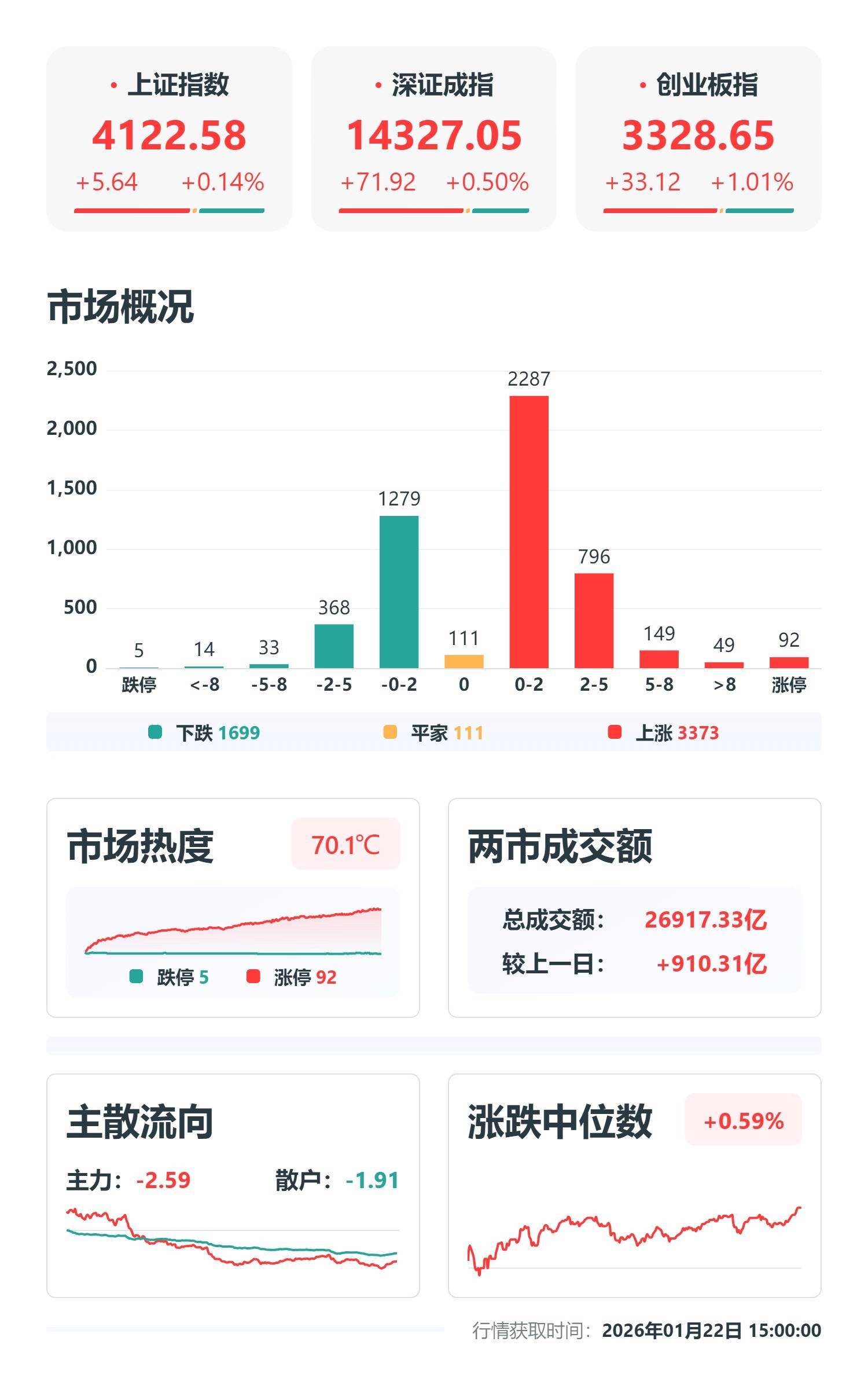 1月22日,A股继续窄幅盘整,根据交易所数据,上证指数涨0.14%报4122.58点,深证成指涨0.5%,创业板指涨1.01%,沪深300涨0.01%,科创50涨0.41%。