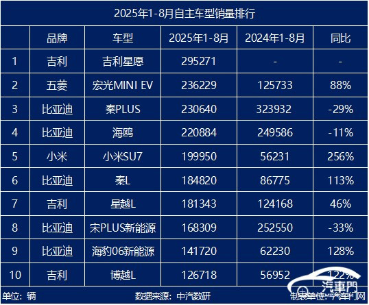 整体看下来,自主阵营中的车型呈现分化加剧的态势。其中,比亚迪旗下秦PLUS、海鸥、宋PLUS新能源等车型出现不同程度下滑,虽有秦L、海豹06新能源等新车型增长弥补,但也反映出其“老款车型面临竞争、需靠新品驱动”的现状;而吉利、五菱、小米等品牌则凭借新车型或差异化定位实现增长。